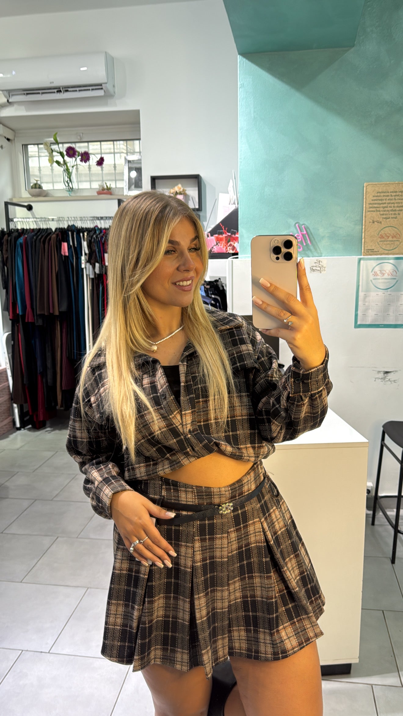 Coordinato con fantasia a quadri, composto da gonna a pantaloncino e camicetta con canotta inclusa. Calzata regolare, taglia unica