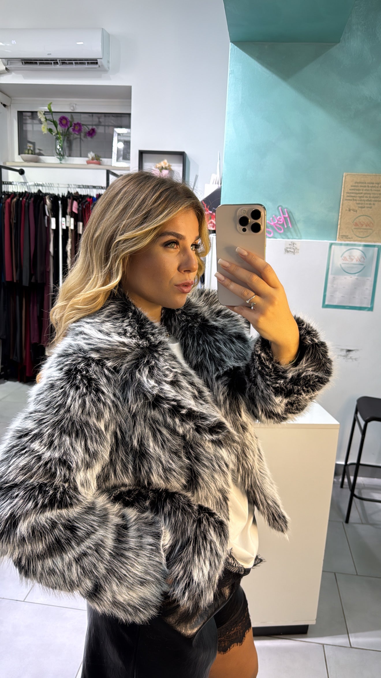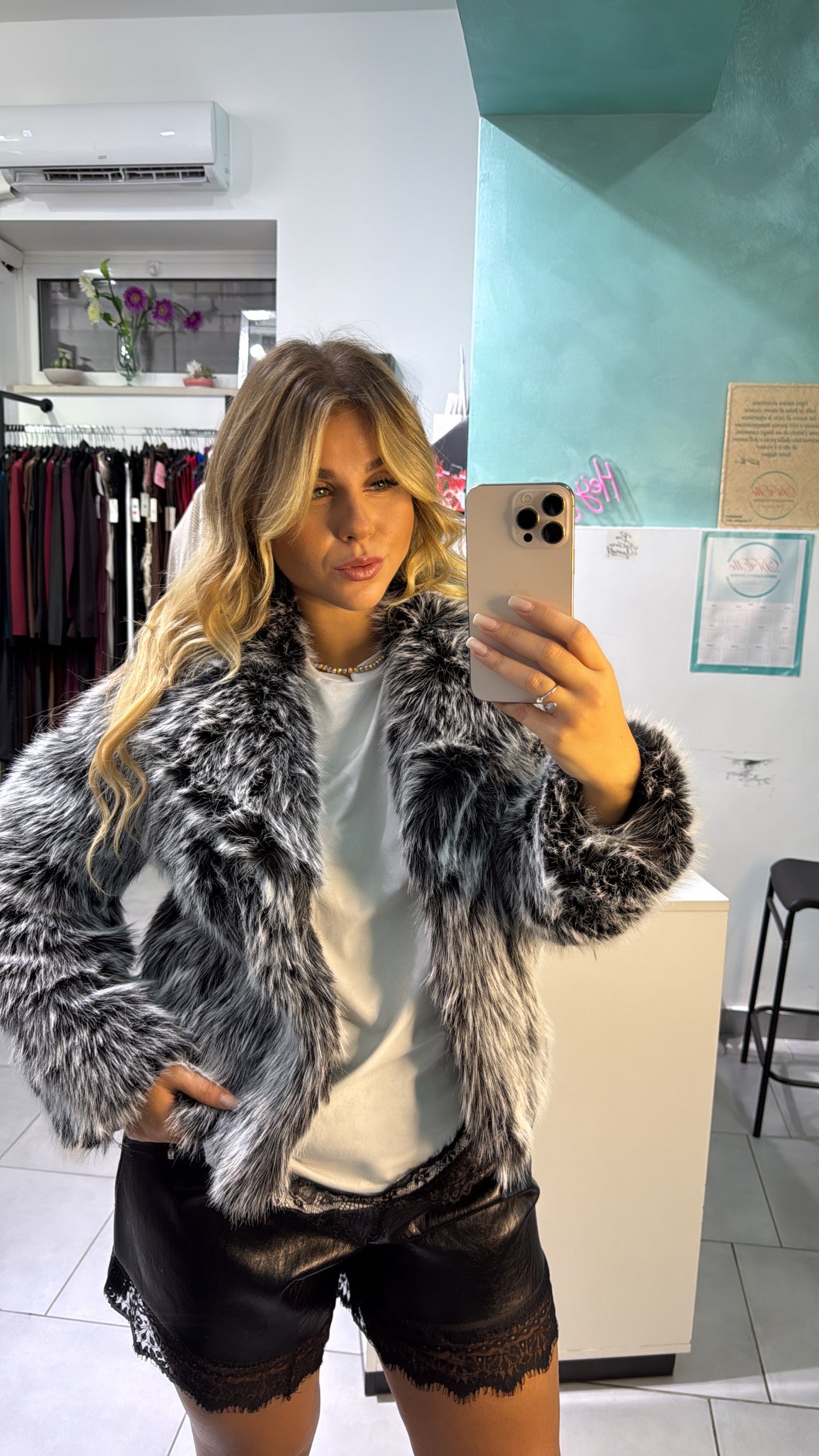 Eco pelliccia con pelo lungo nero e bianco. Calzata regolare, lunghezza media. Taglia unica