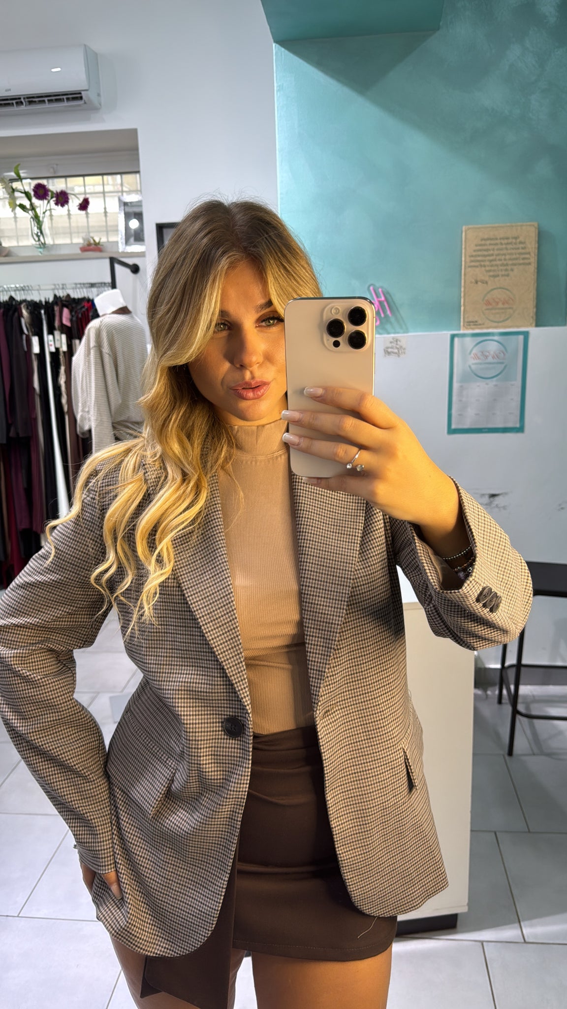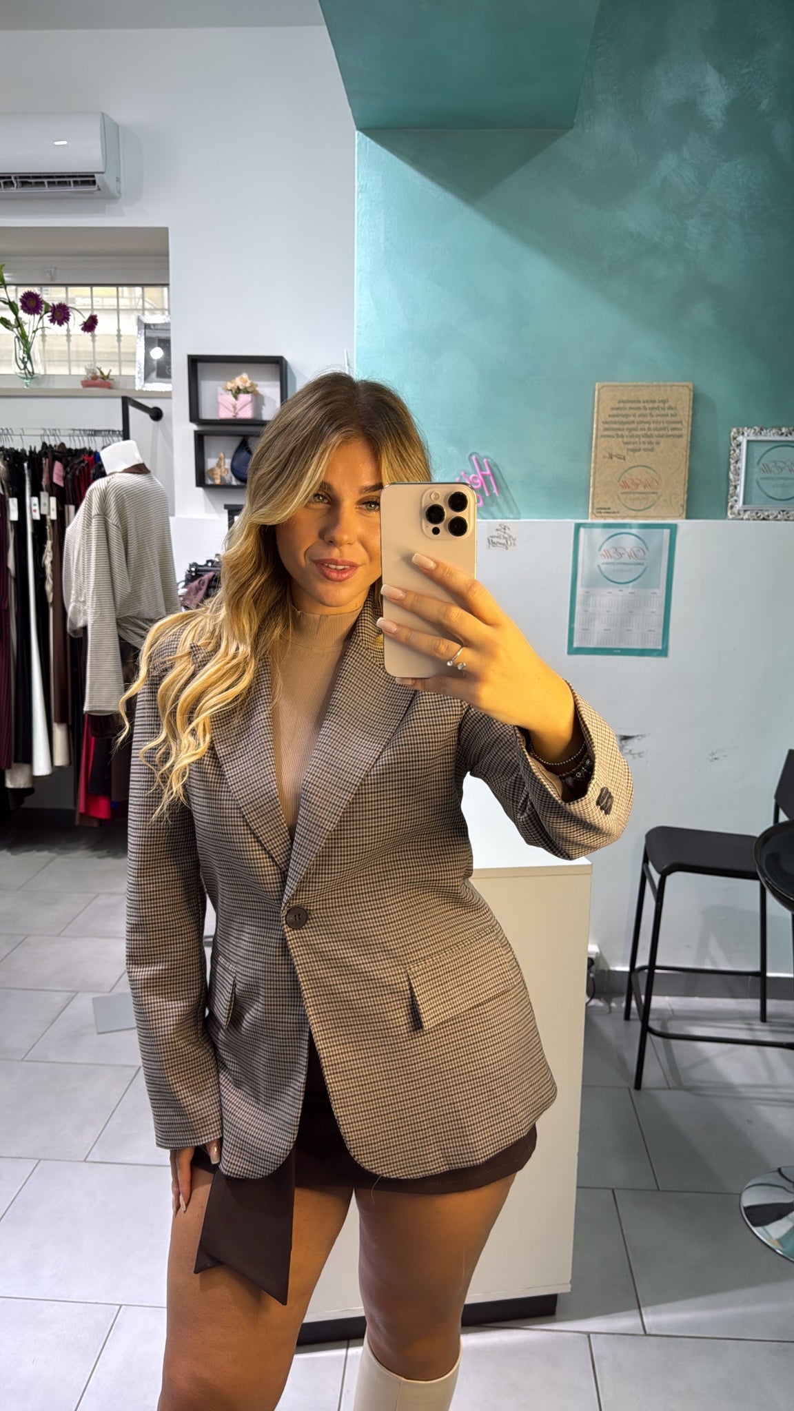 Giacca con fantasia a quadretti, chiusura a bottone e finti taschini laterali ,calzata regolare , taglia unica.