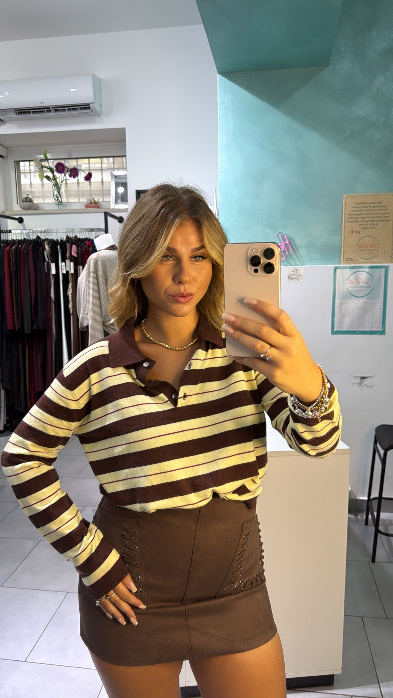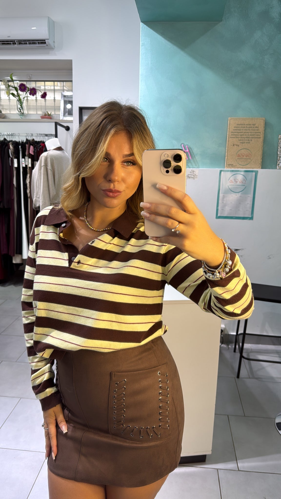 Gonna di camoscio con tasconi laterali a intreccio. Calzata regolare, la modella indossa taglia L