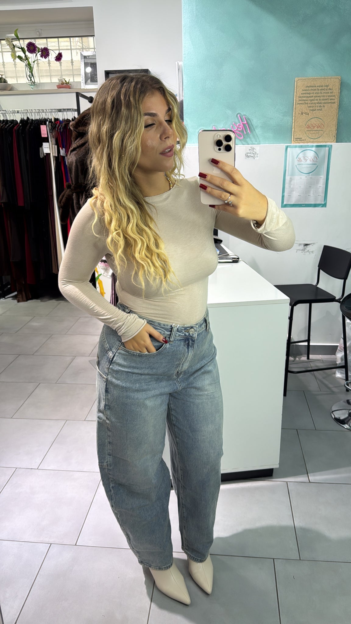 Jeans ballon lavaggio chiaro, con tasconi sul retro. Calzata regolare, tessuto elasticizzato. La modella indossa taglia L