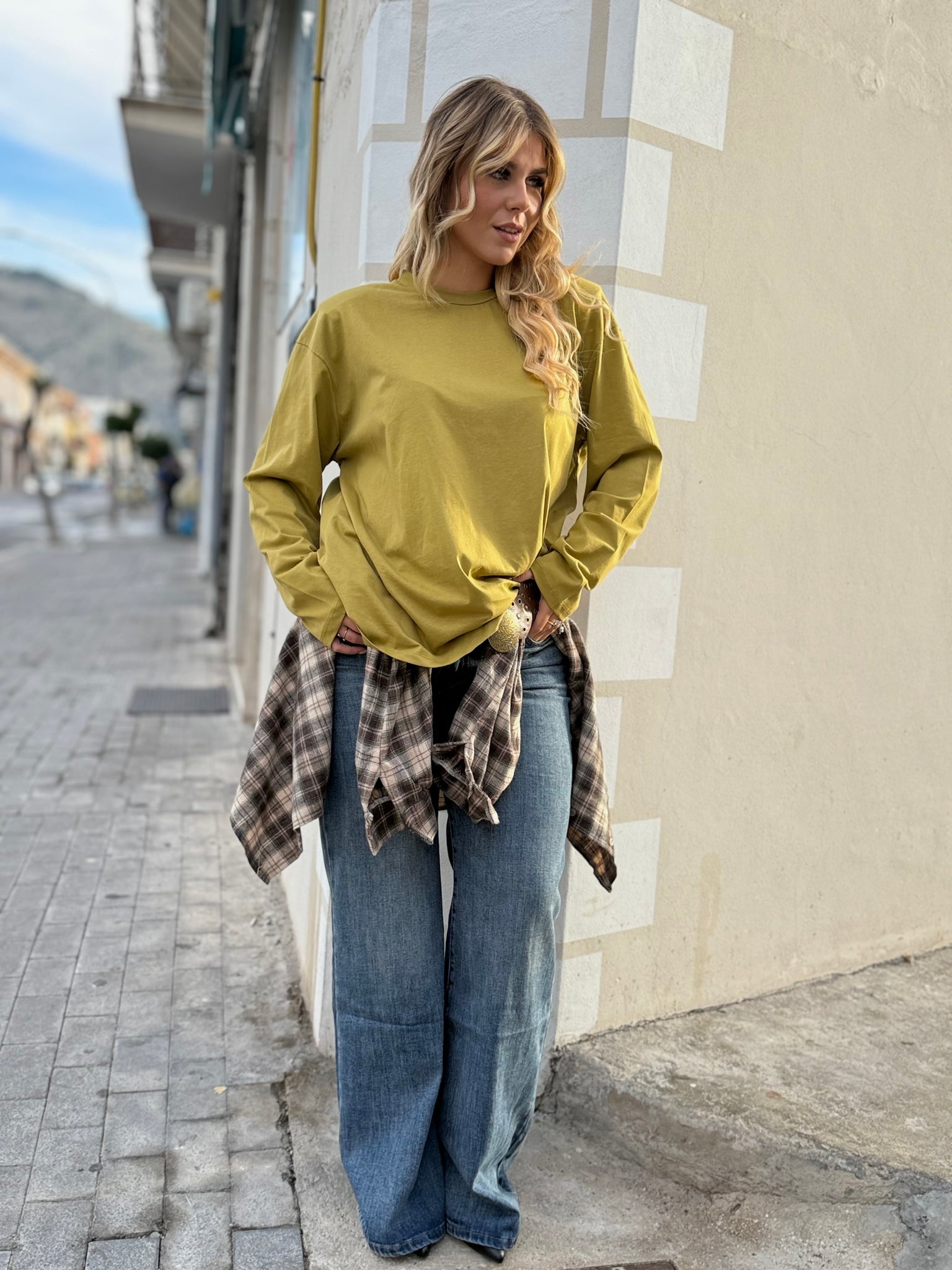 Jeans lavaggio scuro, gamba ampia e lunga. Calzata slim poco elasticizzato. La modella indossa taglia 46 (corrispondente ad una L)