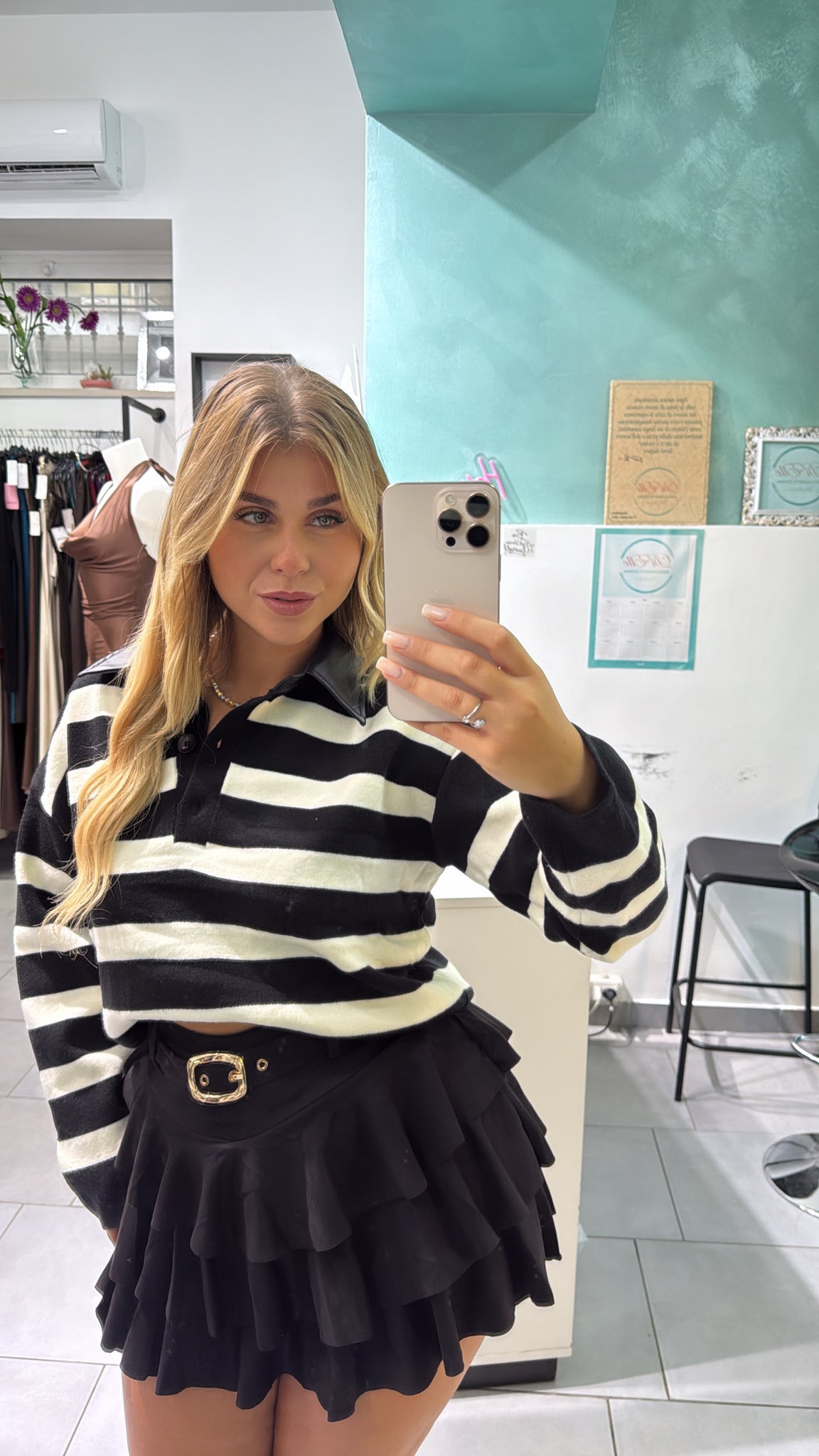 Maglioncino con fantasia linee, bottoncini per regolare lo scollo. Calzata regolare, tessuto elasticizzato , taglia unica