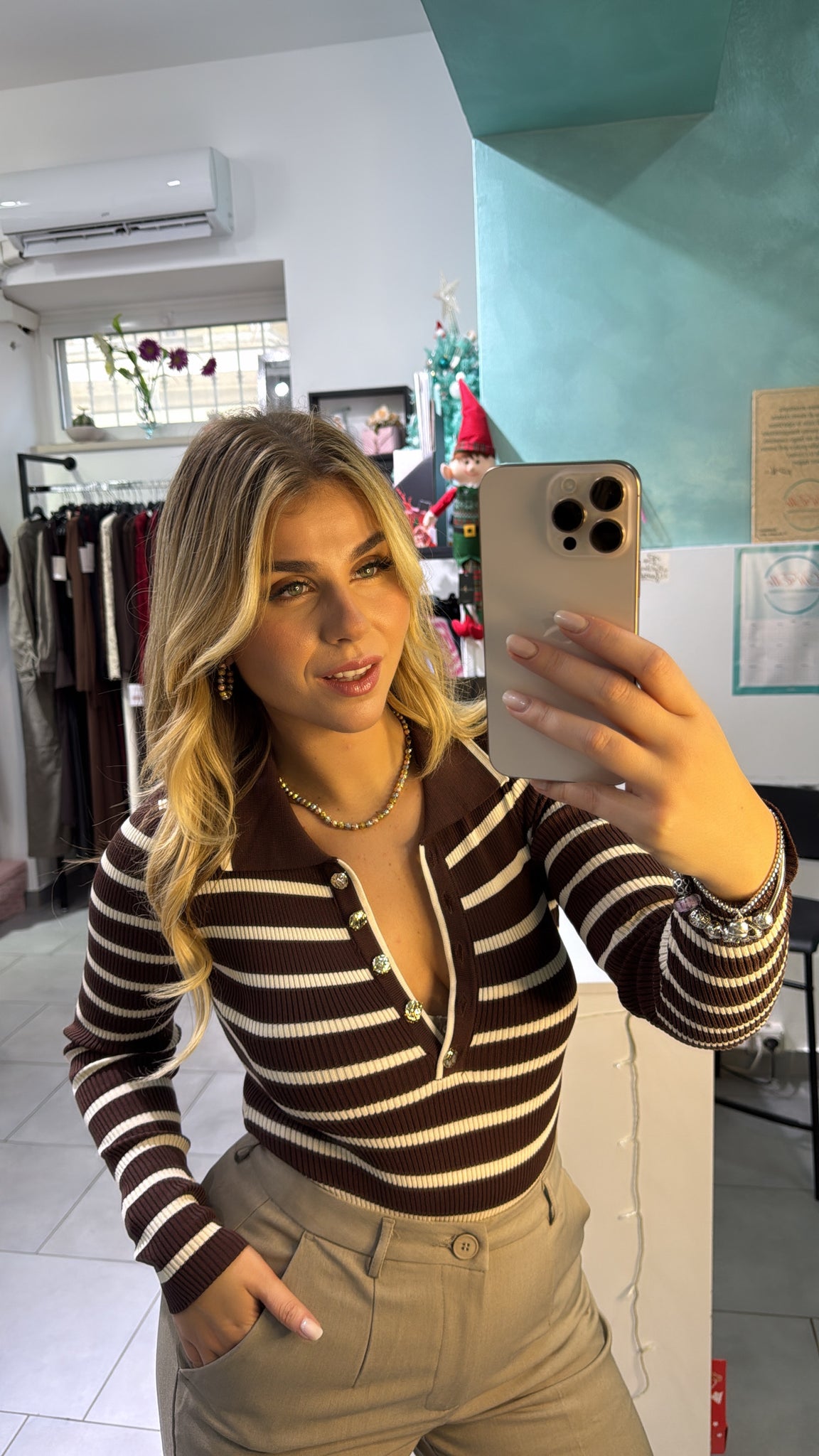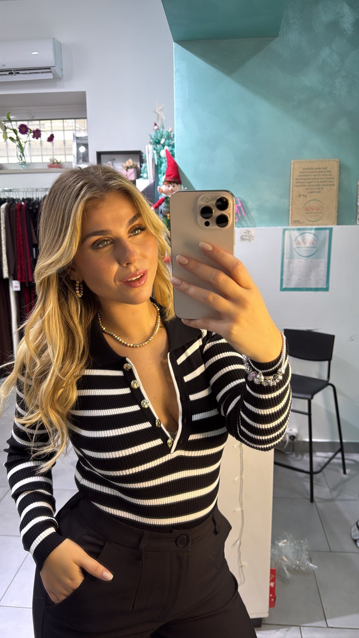 Body con fantasia a linee, scollo a V con bottoncini oro regolabili. Calzata regolare, tessuto elasticizzato. Taglia unica