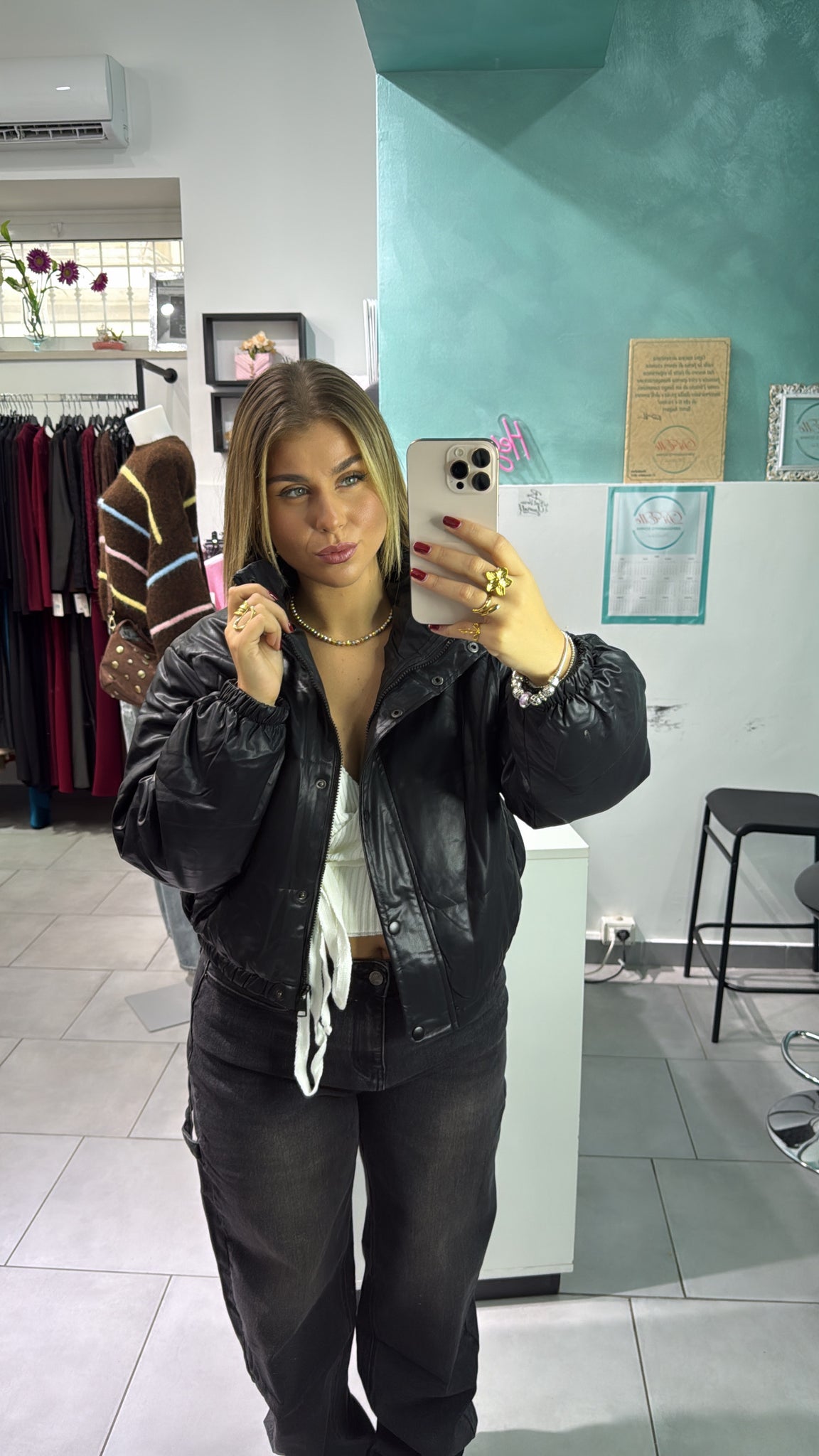 Bomber in ecopelle, calzata regolare, chiusura con zip e bottoncini. La modella indossa taglia L