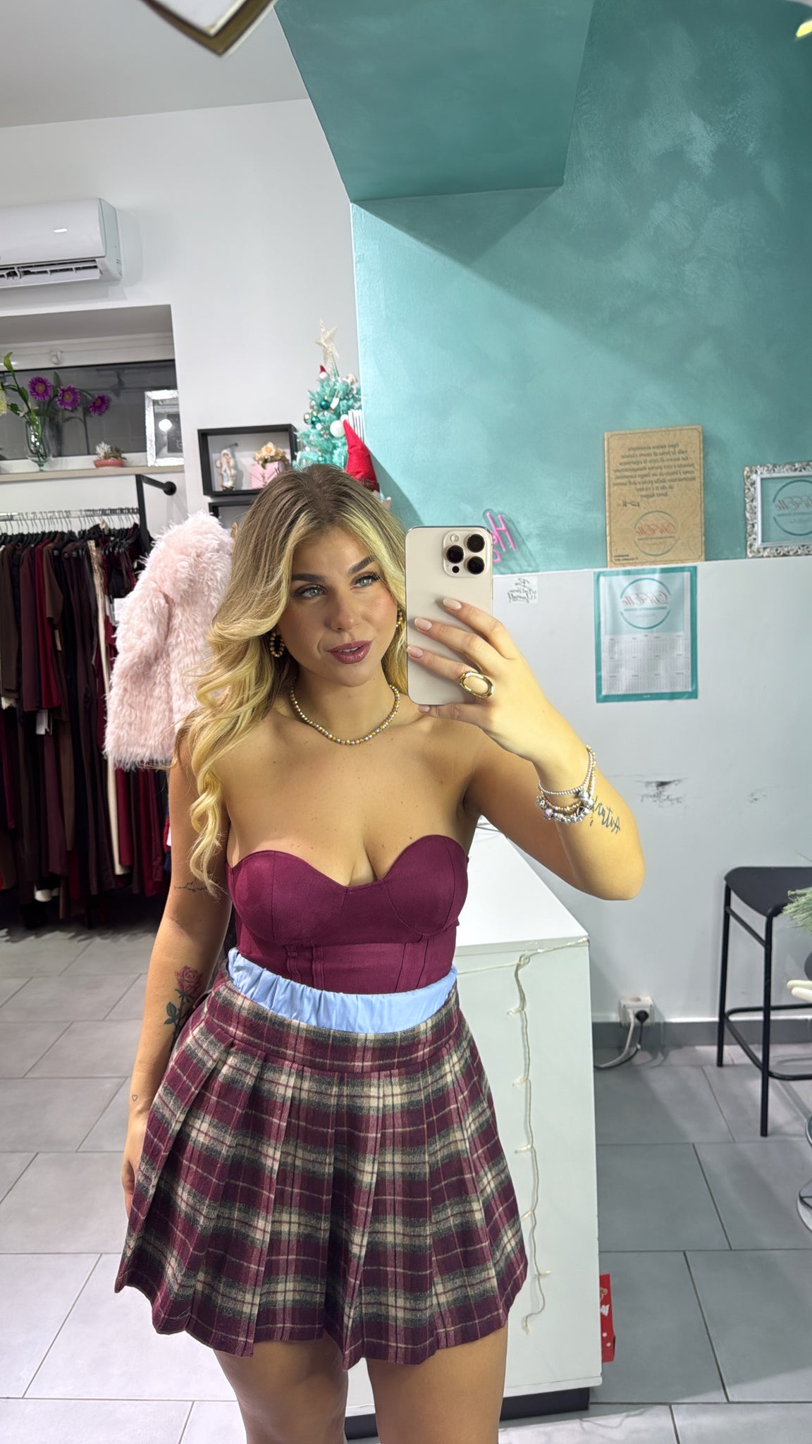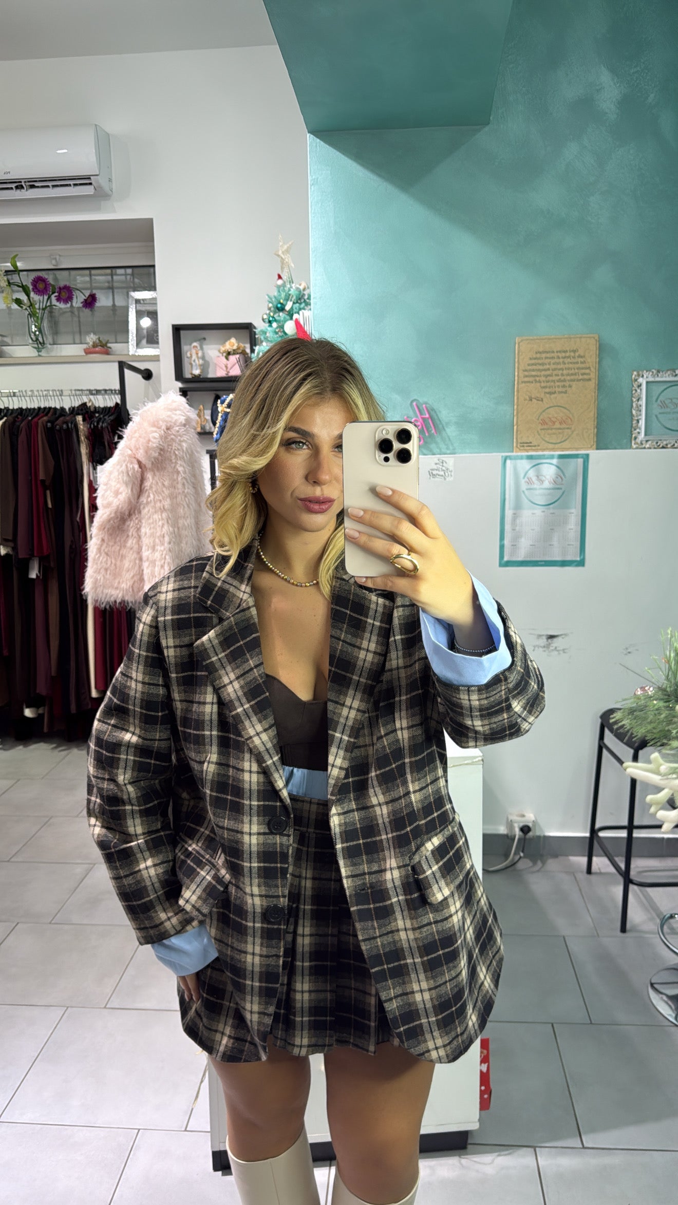 Coordinato con fantasia a quadri, composto da blazer over con bordino di camicia alla manica. Gonna con elastico in vita, bordino con effetto camicia, taglia unica, calzata regolare.