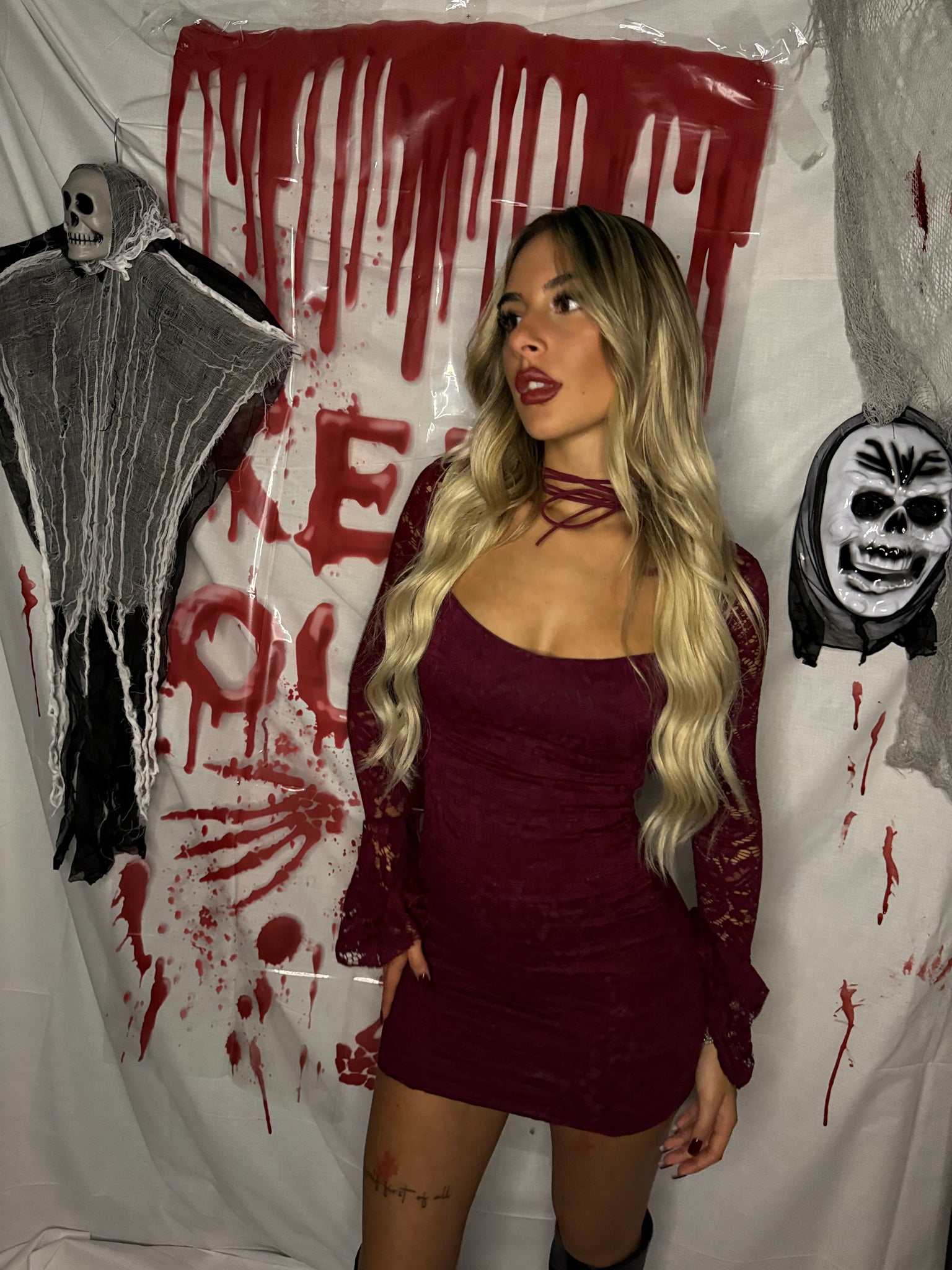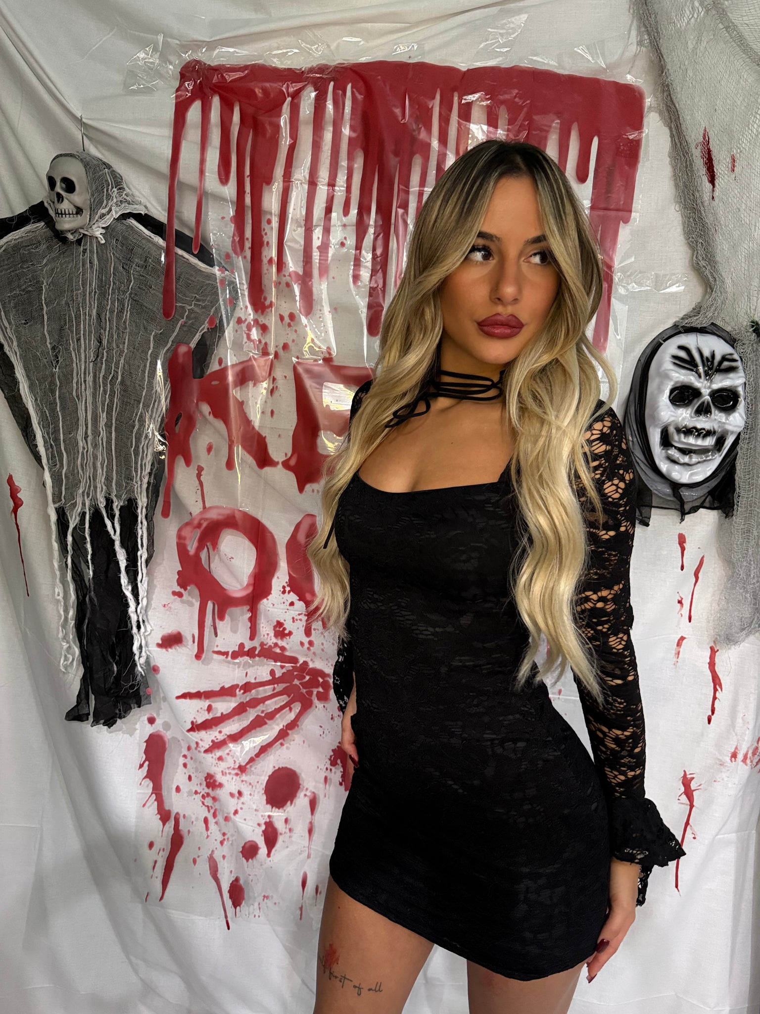Abitino aderente in pizzo con manica a guanto. Calzata regolare, tessuto elasticizzato. Taglia unica