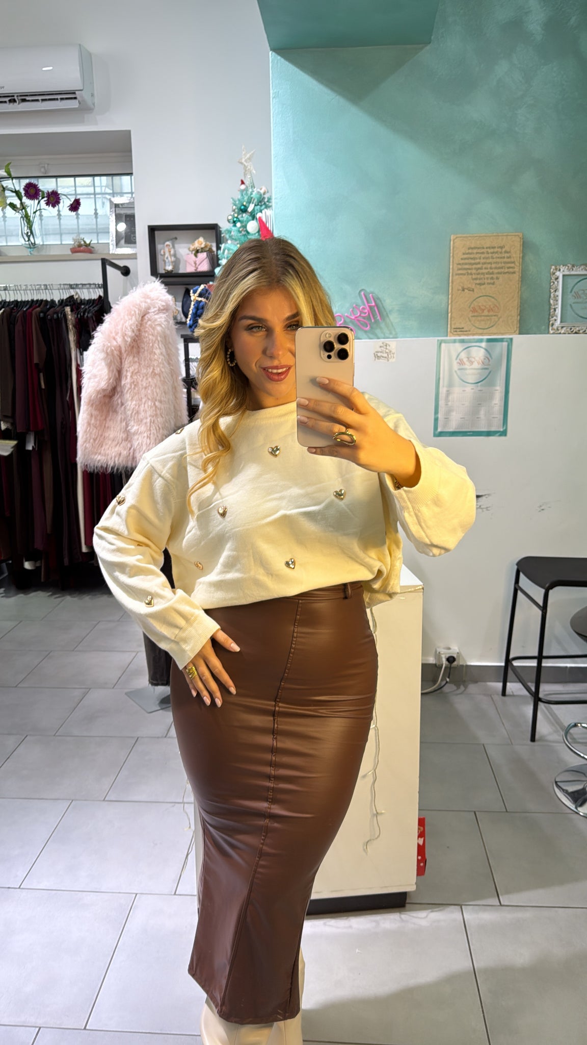 Gonna lunga aderente in ecopelle , con chiusura a zip sul retro e spacco. Calzata regolare, tessuto elasticizzato. Taglia unica