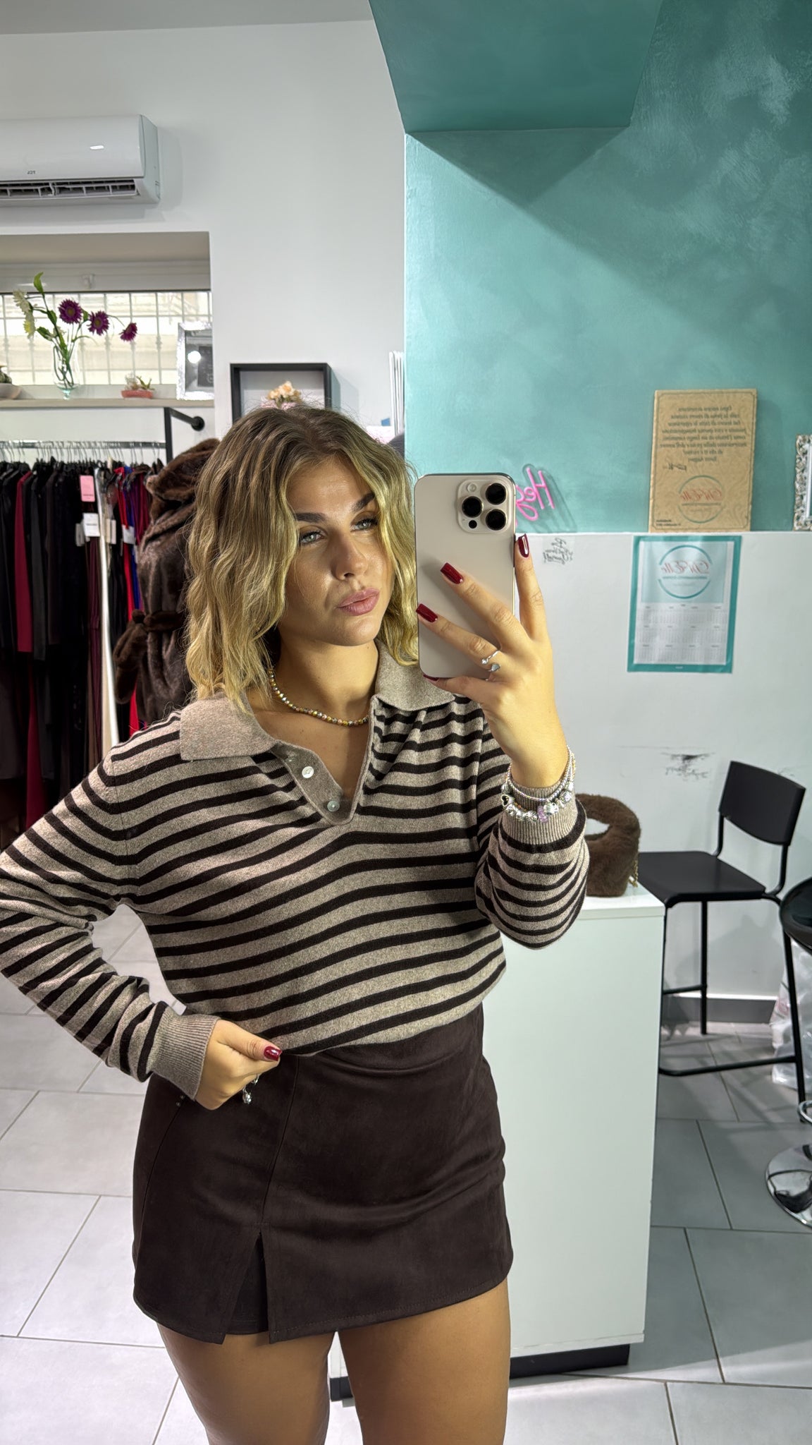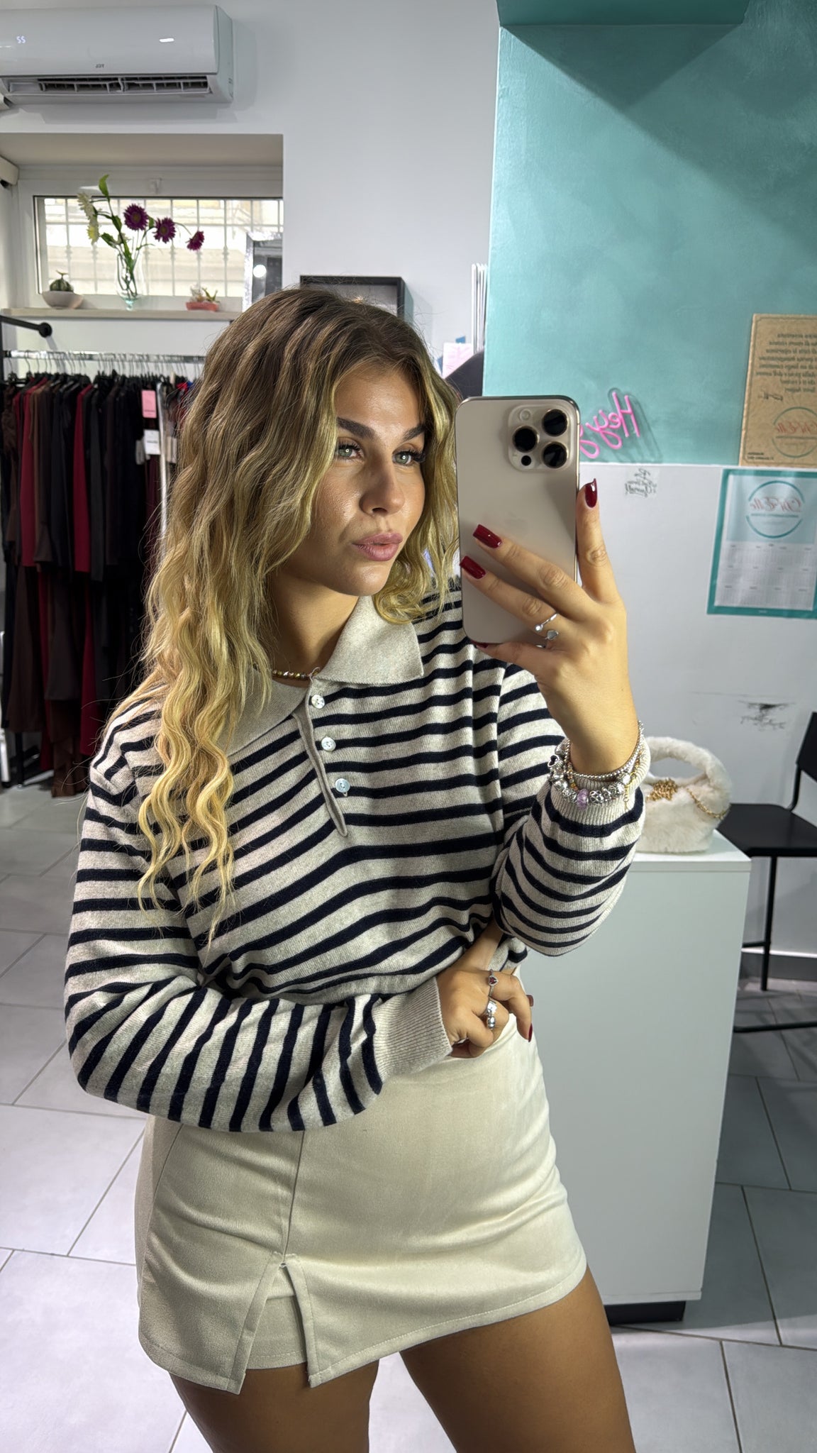 Maglia polo con fantasia a linee, chiusura con bottoncini regolabili, tessuto in cashmire. Calzata regolare, tessuto elasticizzato, taglia unica