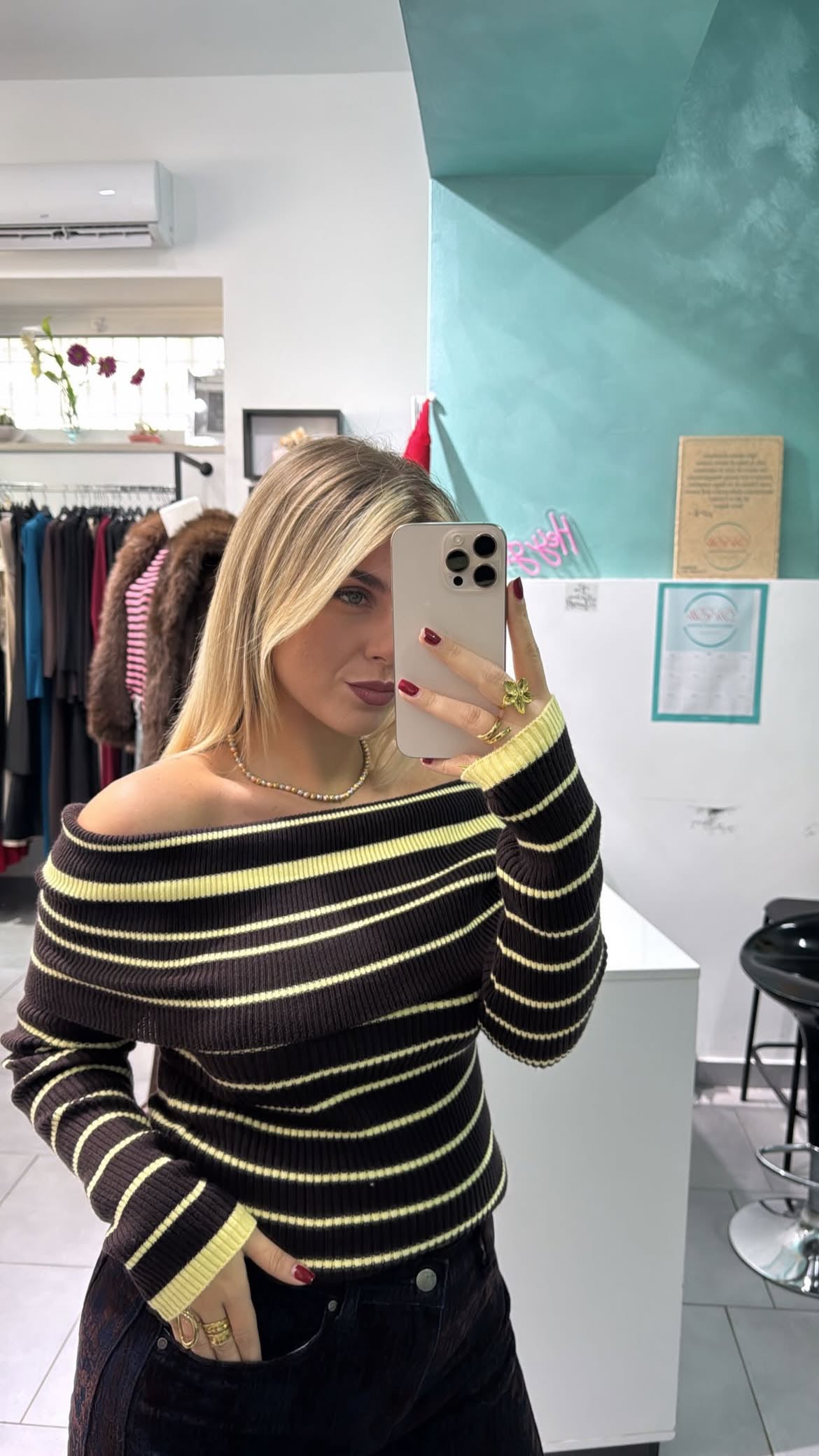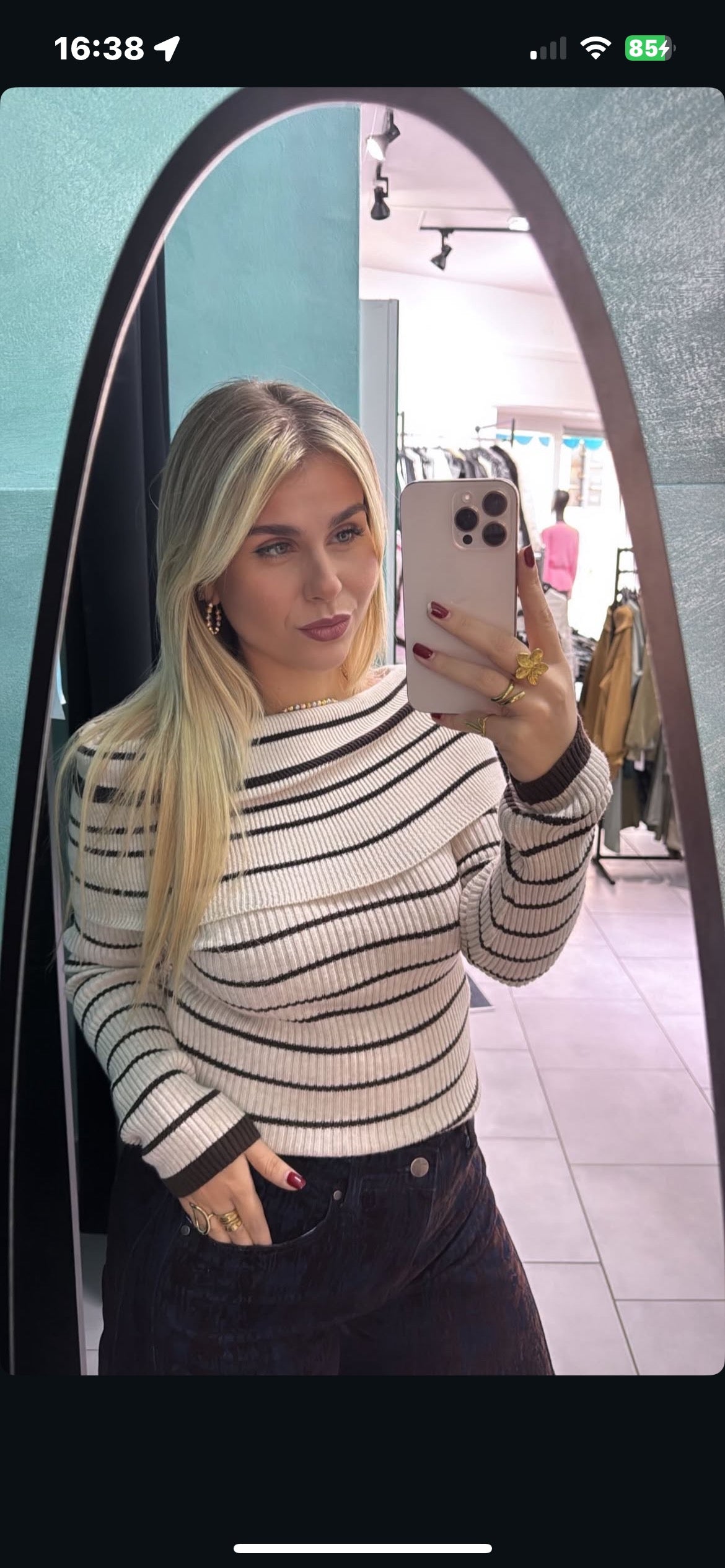 Maglione con fantasia a linee , scollo a barca. Calzata regolare, tessuto elasticizzato. Taglia unica