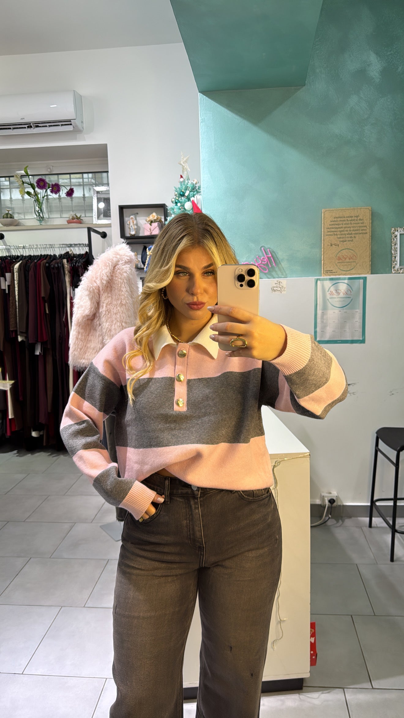 Maglioncino con fantasia a linee, dettaglio bottoncini oro e colletto a polo. Calzata regolare, tessuto elasticizzato. Taglia unica